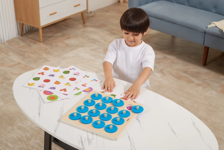 Díky 10 výměnným kartám s barevnými motivy (zvířata, ovoce, zelenina, tvary aj.) snadno přizpůsobíte náročnost věku a dovednostem dítěte. Hra je vyrobena z odolného dřeva a opatřena bezpečnými, netoxickými barvami, takže je ideální pro každodenní používání doma i v mateřských školkách.