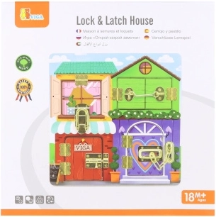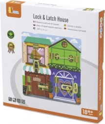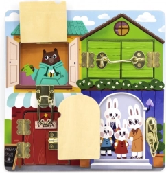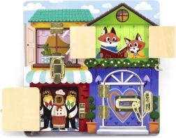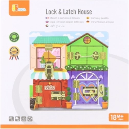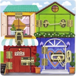 Objevte hravou a vzdělávací hračku pro nejmenší: dřevěná manipulační tabule ve tvaru domečku se čtyřmi různými zámky a západkami. Podporuje jemnou motoriku, koordinační dovednosti a logické myšlení díky zábavnému otevírání dvířek se zvířátky. Barevné provedení láká k objevování a nabízí smysluplnou hru každý den.