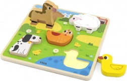 Tato roztomilá dřevěná skládačka s tématem farmy obsahuje 5 robustních dílků – koníka, ovečku, slepičku, pejska a kachničku. Děti vkládají zvířátka do odpovídajících otvorů na barevné podložce, čímž si trénují rozpoznávání tvarů a vizuální paměť.