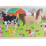 Dřevěné puzzle Na farmě tvoří 96 dílků, které jsou umístěny na pevné dřevěné desce s okrajem, sloužícím jako podložka pro skládání. Pod deskou je podkladový obrázek, který napomáhá snadnějšímu skládání. Ideální způsob, jak zabavit děti a zároveň podpořit jejich rozvoj.