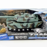 Zábavný tank pro děti od 3 let s tmavým maskováním nabízí zvuk střelby, svítící dělo a otáčecí hlaveň do všech směrů. Pohyb zajišťuje setrvačník, napájení 3× AG13 (baterie jsou součástí balení). Měřítko 1:32, rozměry cca 22 × 8 cm.
