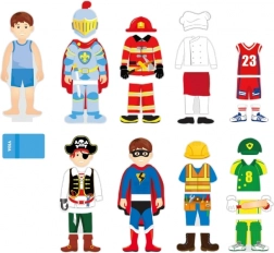 Oblékejte figurku do různých rolí – pirát, sportovec, rytíř či superhrdina. Děti si procvičí koordinaci oko–ruka a tvořivost při skládání vlastních outfitů.