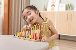 Na podstavci jsou vytištěny jednoduché příklady. Dítě posouvá korálky a přiřazuje správný počet – názorné a zábavné procvičování sčítání i odčítání.