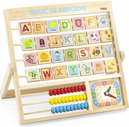 Hravé učení doplňuje praktická výuka času s přehlednými hodinami. Každé písmeno je doplněno slovem v češtině, což napomáhá lepšímu zapamatování a rozšiřování slovní zásoby.
