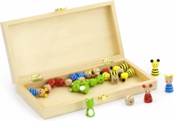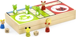 - Obsah balení: 16 dřevěných figurek (4 žabky, 4 včeličky, 4 berušky, 4 motýlci), 4 kostky, herní plán/box