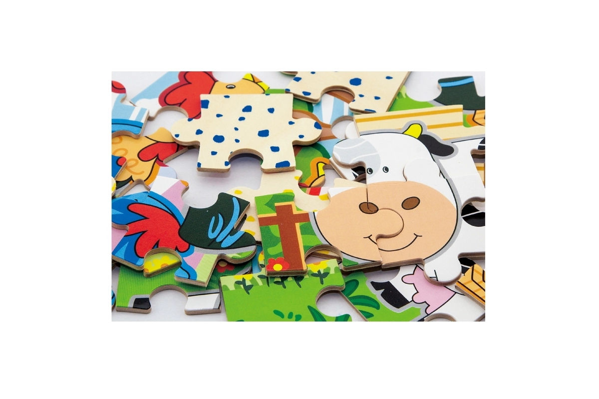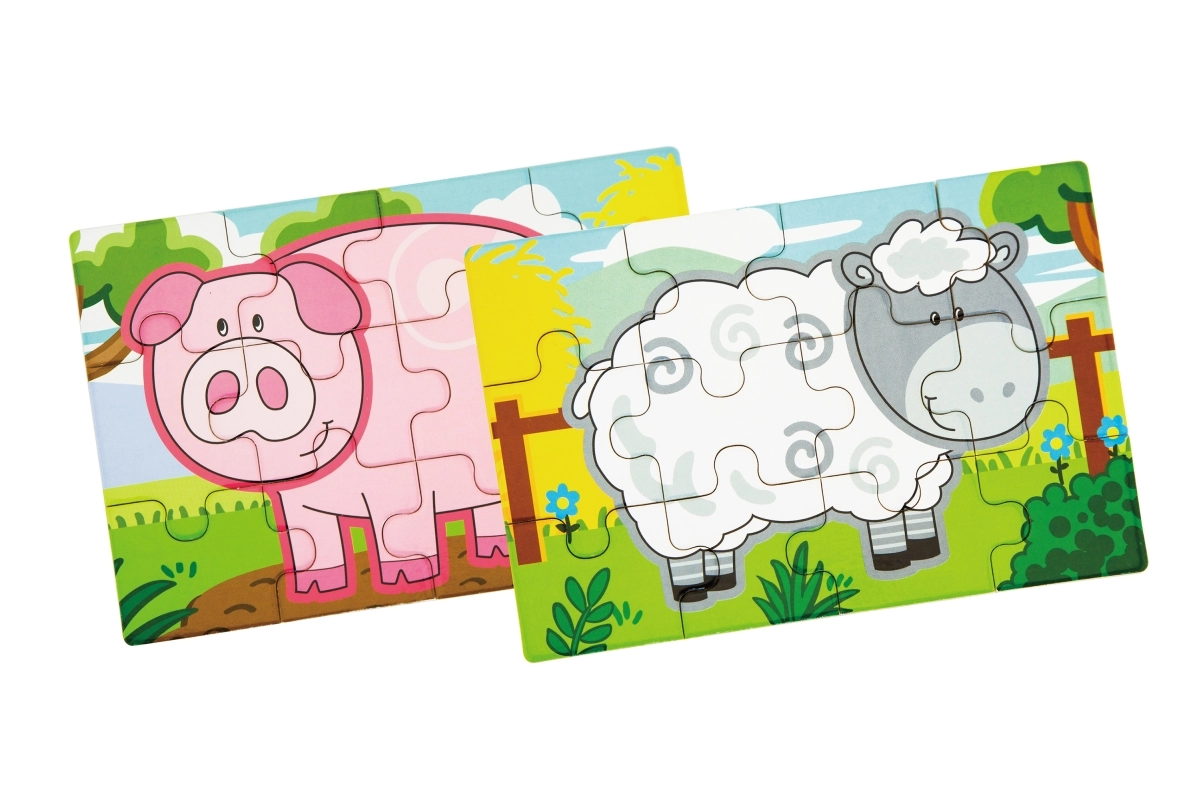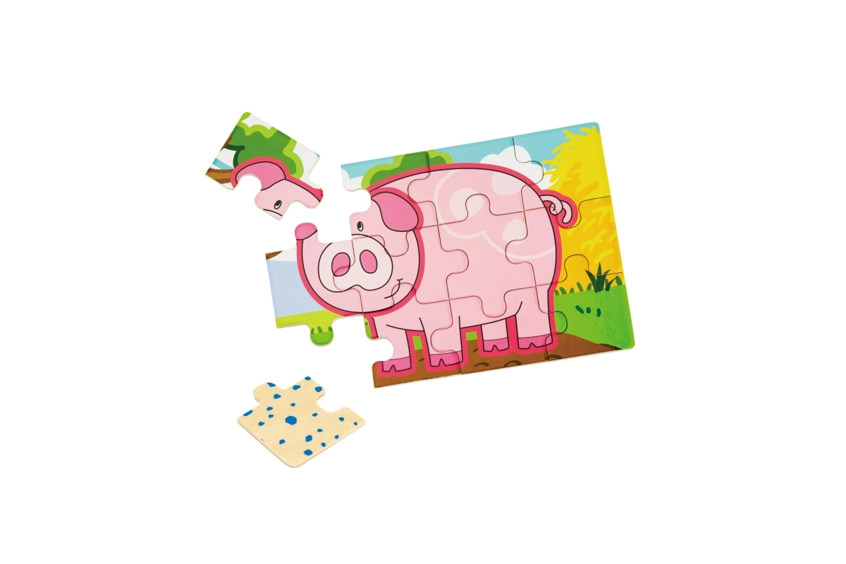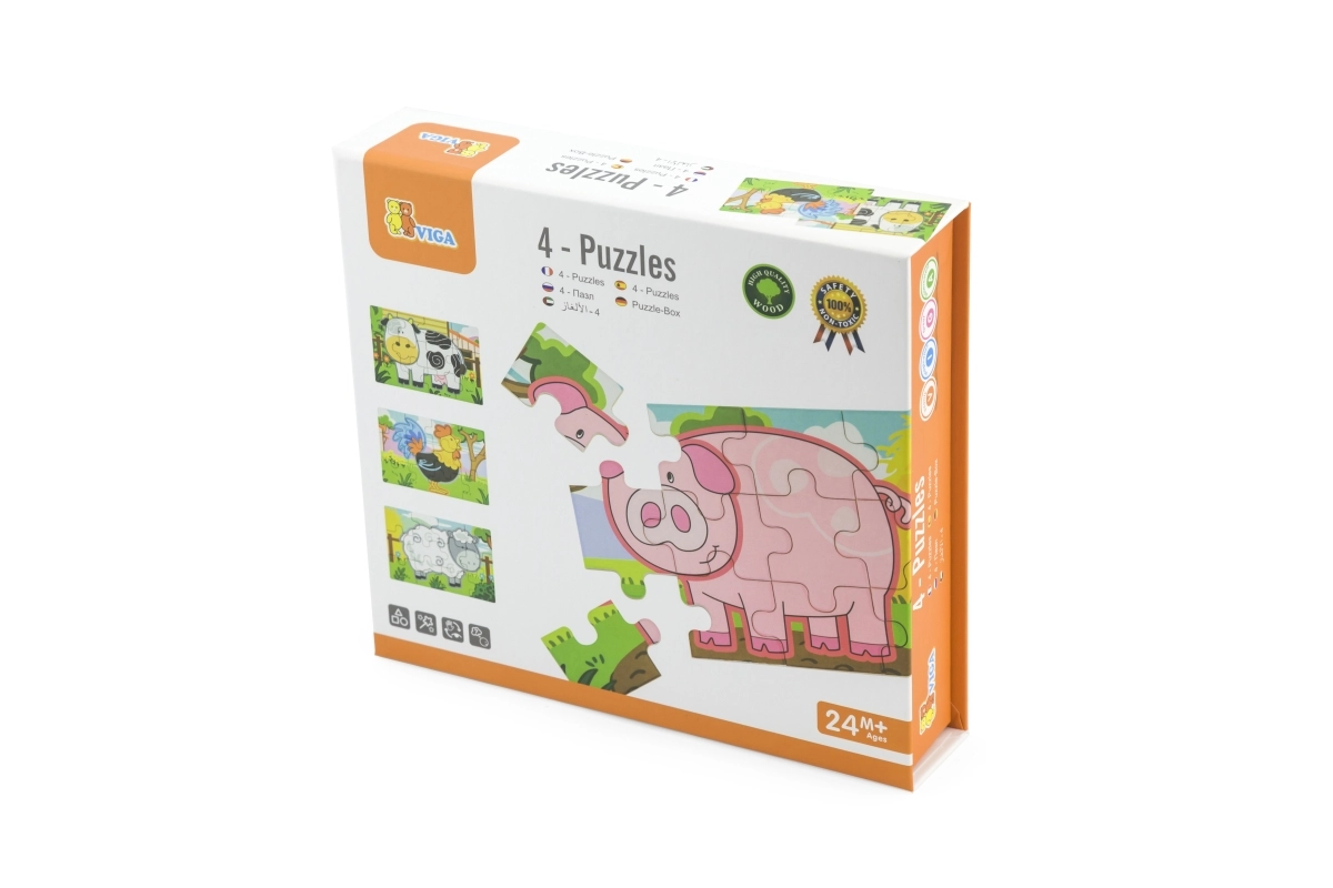 Set obsahuje čtyři samostatné puzzle s oblíbenými zvířaty z farmy – prasátko, kravičku, kohouta a ovečku. Každý obrázek má jasné barvy a jednoduché tvary pro snadné skládání.