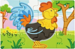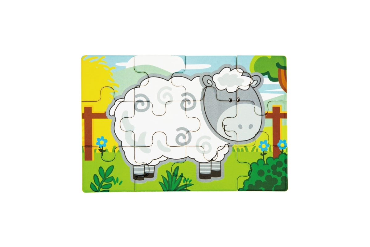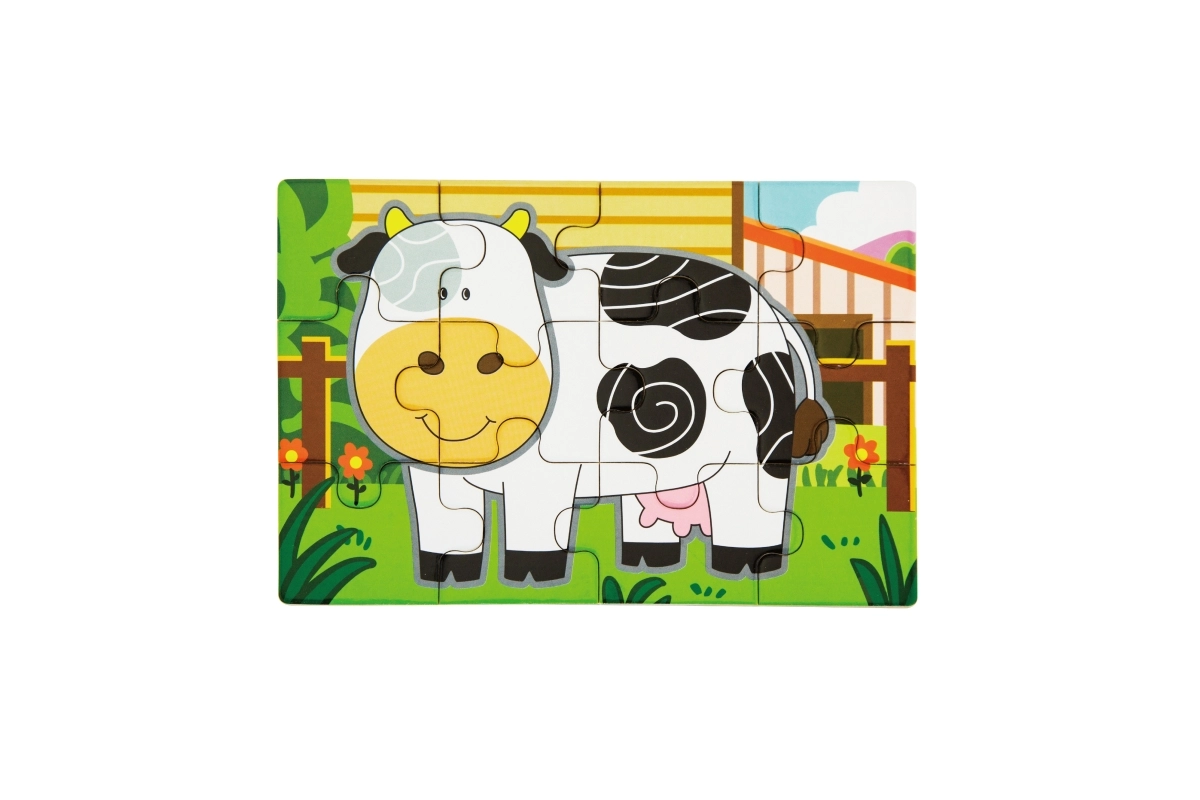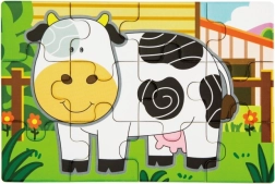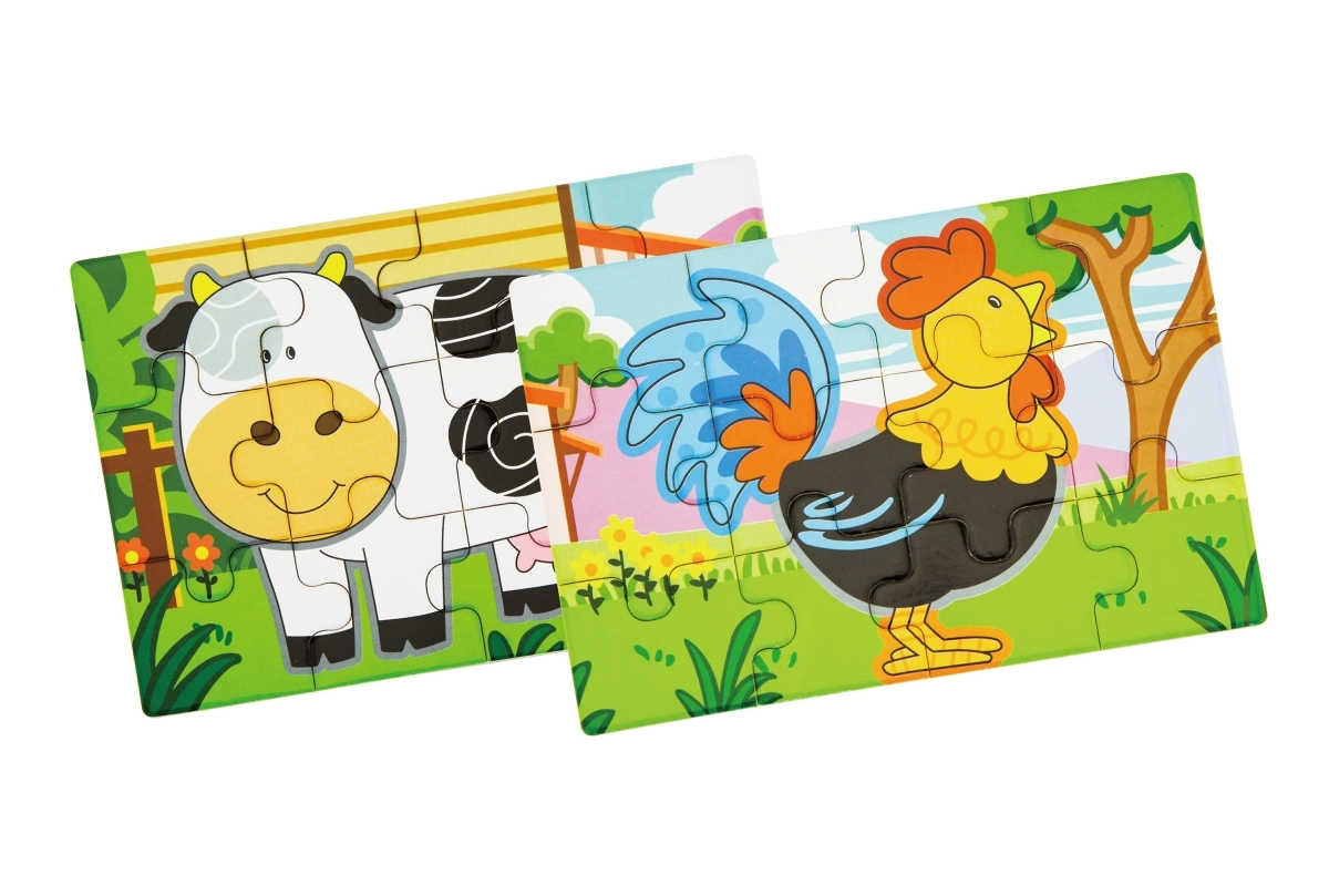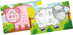 Set obsahuje čtyři samostatné puzzle s oblíbenými zvířaty z farmy – prasátko, kravičku, kohouta a ovečku. Každý obrázek má jasné barvy a jednoduché tvary pro snadné skládání.