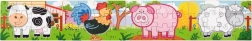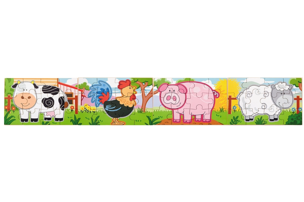 Tento barevný set dřevěných puzzle s roztomilými zvířátky z farmy potěší každé zvídavé dítě. Velké a pevné dílky se dobře drží v malých ručičkách a díky jasným ilustracím se děti snadno orientují při skládání. Z puzzlí lze sestavit 4 jednotlivé obrázky nebo je propojit do jednoho dlouhého obrazu celé farmy.