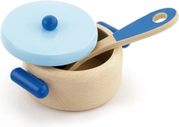 Kompletní výbava pro hru na vaření: hrnec s pokličkou, pánev s vajíčkem, lžíce, slánka, pepřenka a textilní chňapka. Ideální pro první kuchyňské dobrodružství.