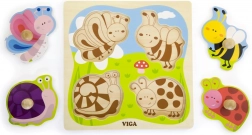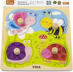 Dřevěná vkládačka VIGA se 4 velkými dílky s úchytkami je ideální první puzzle pro nejmenší. Barevné motivy hmyzu a zvířátek ze světa louky děti přirozeně motivují k objevování a učení. Vyfrézované okraje na pevné dřevěné podložce pomáhají, aby každý dílek držel spolehlivě na svém místě.