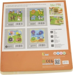 Objevte kvalitní dřevěnou vkládačku VIGA s motivem louky a čtyřmi roztomilými zvířátky – motýlek, včelka, beruška a šnek. Velké dřevěné úchytky usnadní manipulaci a pod každým dílkem je nápovědný obrázek pro správné umístění. Tato hračka rozvíjí jemnou motoriku, koordinaci ruka–oko, vnímání tvarů a paměť. Vhodné od 18 měsíců.