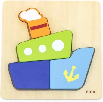 Objevte první dřevěné puzzle pro nejmenší od značky Viga. Tato jednoduchá skládačka ze 4 dílků ve tvaru lodi na pevné dřevěné podložce podporuje jemnou motoriku, koordinaci oko–ruka a rozpoznávání tvarů. Vyrobeno z kvalitních materiálů a barveno netoxickými barvami – bezpečná zábava pro děti i životní prostředí.
