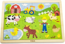 Dřevěné puzzle s farmářským motivem zobrazuje různé aspekty farmářského života, včetně zvířat a farmáře, což je atraktivní pro děti.