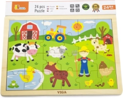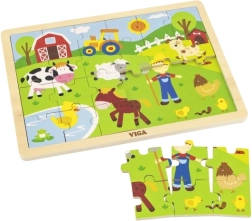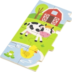 Toto dřevěné puzzle s farmářským motivem je ideální pro děti, které se právě seznamují se světem skládání a hlavolamů. Obrázkové ztvárnění farmy je barevné a atraktivní, lákající ke hře a učení. Puzzle lze