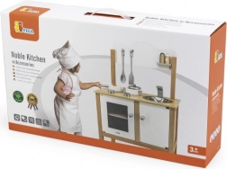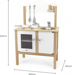 Dřevěná dětská kuchyňka značky Viga je ideální pro malé kuchaře, kteří chtějí napodobovat vaření. Tato dřevěná konstrukce s moderním bílým a přírodním dřevěným povrchem je odolná a zároveň stylová, díky čemuž se hodí do jakéhokoli dětského pokoje.