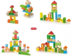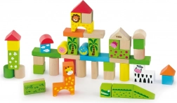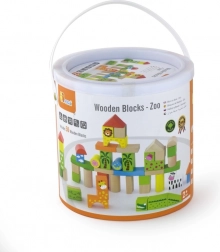 Barevná sada dřevěných kostek s motivy zoo pro děti od 2 let. V kyblíku najdete 50 dílků a obrázkovou brožuru se stavěcími návody ve třech úrovních. Podporuje kreativitu, jemnou motoriku a prostorovou představivost, navíc s praktickým balením v kyblíku pro snadné ukládání.