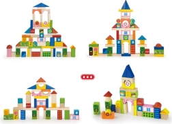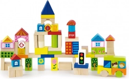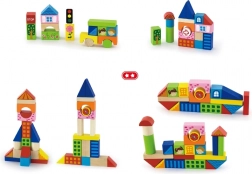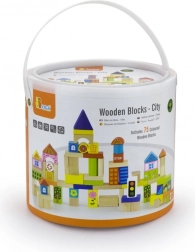 Tato dřevěná stavebnice nabízí 75 různobarevných kostek pro stavění městských scenérií. Součástí balení je i obrázková brožura s návody, která inspiruje děti k tvořivému stavění. Vše je uložené v praktickém kyblíku s rukojetí o rozměrech cca 22,5 x 20 cm.