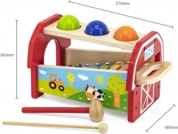 Tato dřevěná zatloukačka se xylofonem kombinuje aktivní hru s hudebním objevováním. Děti kuličky zatloukají skrz otvory, sledují jejich pohyb a poté si na barevných lamelách xylofonu vyťukají jednoduché melodie. Díky tomu si nenásilně procvičují přesnost, rytmus i trpělivost.