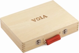 Pevný dřevěný kufřík s kovovými přezkami a červeným madlem udrží vše na svém místě, takže se žádný kousek neztratí. Díky přehlednému uspořádání má každé náčiní své místo a celá sada je snadno přenosná na návštěvy, cesty i do dětského pokoje.
