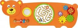 Smyslová tabule Medvídek je navržena podle principů Montessori tak, aby děti přirozeně motivovala k objevování a procvičování dovedností. Nabízí více druhů aktivit: otáčení ozubených kol, vedení kuličky v labyrintu, pozorování v bezpečném zrcátku a trénink úchopu pomocí šroubků na závitu. Díky robustní dřevěné konstrukci a možnosti nástěnné instalace se skvěle hodí do dětských pokojíčků, heren i mateřských škol.