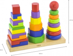 Dřevěná skládačka pyramida je ideální hračkou pro děti od 2 let, která podporuje rozvoj motoriky a rozpoznávání tvarů díky barevným geometrickým dílkům.