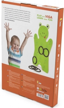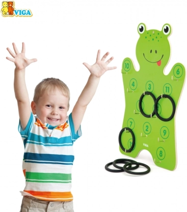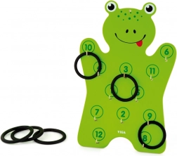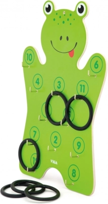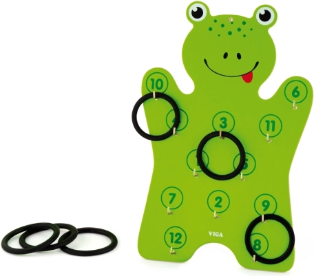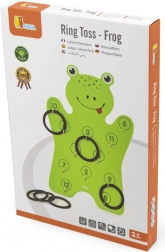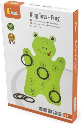 Součástí je dřevěná deska ve tvaru žáby a 6 kroužků – stačí rozbalit a začít házet.