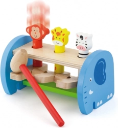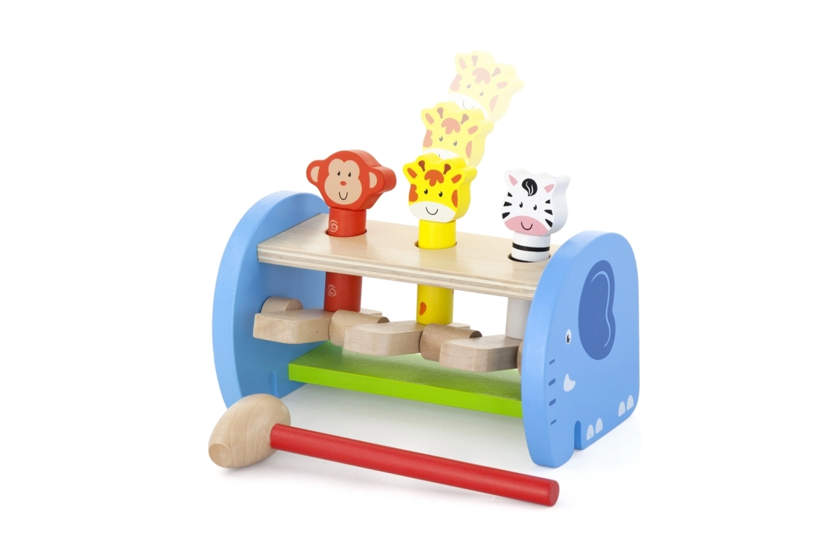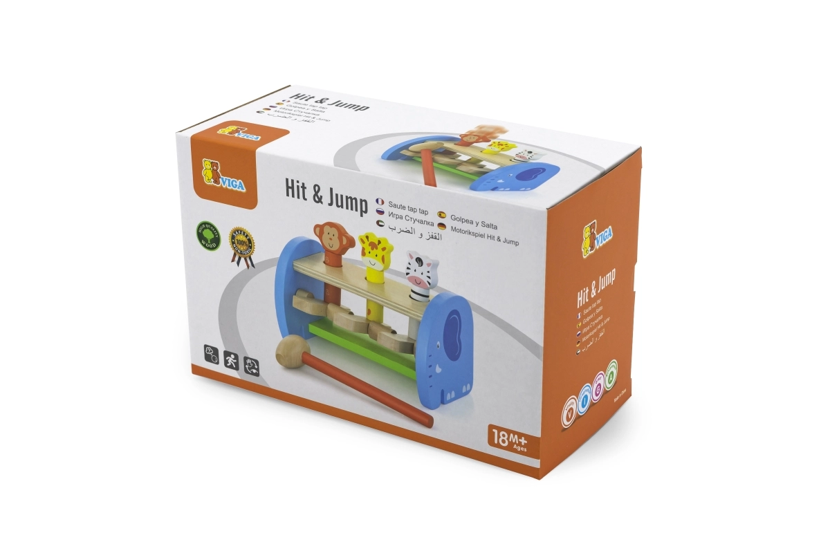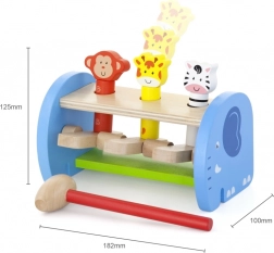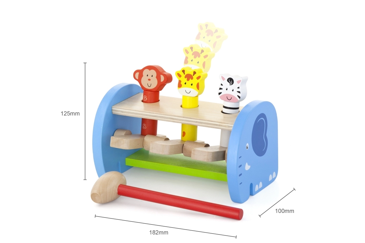 Tato kvalitní dřevěná hračka nabízí bezpečné a barevné hraní s roztomilými zvířátky. Děti pomocí kladívka poklepávají na mechaniku, která zvířátka nechá vyskočit – zdokonalují tak úchop, sílu stisku i přesnost pohybu. Pevná konstrukce a hladké hrany zajišťují bezpečí při každodenním používání.