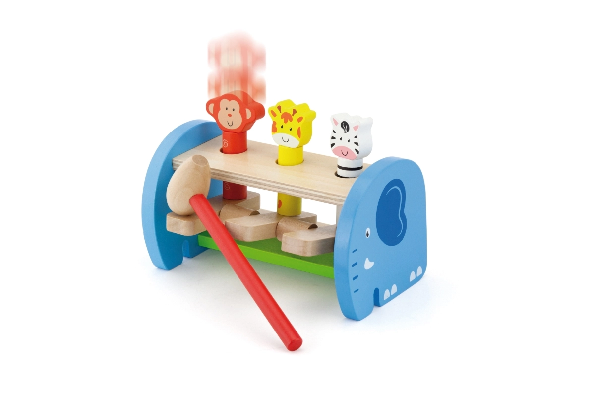 Po úderu kladívkem zvířátka vyskočí – děti okamžitě vidí výsledek svého pohybu a rády jej opakují. Skvělé pro trénink pozornosti a přesnosti.