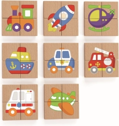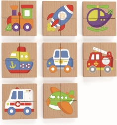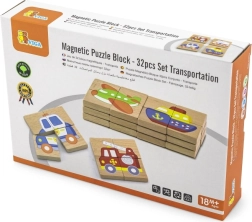 Magnetická dřevěná puzzle od značky Viga umožňuje dětem rozvíjet své logické myšlení a poznávat nové druhy dopravy. Puzzle se skládají z 8 různých obrázků, kde každý z nich představuje jiný dopravní prostředek.