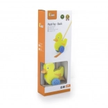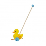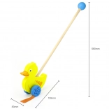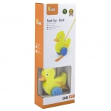 Dřevěný tlačný kačer na tyči je jednoduchou, ale účinnou hračkou, kterou si oblíbí každé dítě. Je to klasická hračka, která přináší mnoho výhod. Roztomilý žlutý kačer při pohybu energicky pohybuje nožičkami, což děti motivuje k procházkám. Tato hračka je balena v estetické krabici s okénkem, které umožňuje vidět kachničku. Uvnitř je tyč s úchytem, která dokonale padne do malé ručky dítěte. Tyč není trvale připevněná, což usnadňuje její skladování. Celá hračka je vyrobena z bukového dřeva a natřena netoxickými barvami v živých barvách, které přitahují pozornost a povzbuzují k hraní, což přináší hodně radosti z hraní.