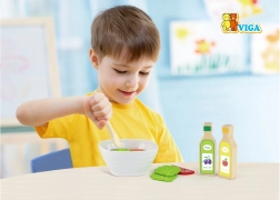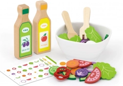 Tato kvalitní dřevěná salátová sada přináší dětem realistickou kuchyňskou zábavu. Díky bohaté výbavě si mohou malí kuchaři připravit vlastní salát, míchat suroviny v misce a servírovat pomocí příboru. Hra podporuje zdravé návyky a přirozeně učí rozpoznávat jednotlivé druhy zeleniny.