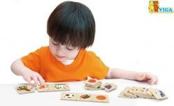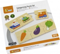 Dřevěné logické puzzle VIGA propojují zábavu s učením. Děti spojují 24 dílků do 8 smysluplných trojic – například tři zvířátka, tři dopravní prostředky nebo tři druhy zeleniny. Tím si přirozeně procvičují rozpoznávání kategorií, soustředění i slovní zásobu.