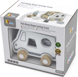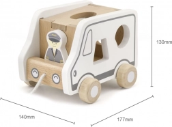 Tato dřevěná tahačka ve tvaru nákladního auta spojuje dvě oblíbené aktivity – tahání na provázku a vkládání tvarů. Děti rozvíjejí poznávání tvarů a prostorové vnímání, zatímco si užívají pohyb a fantazijní hru s roztomilým autíčkem.