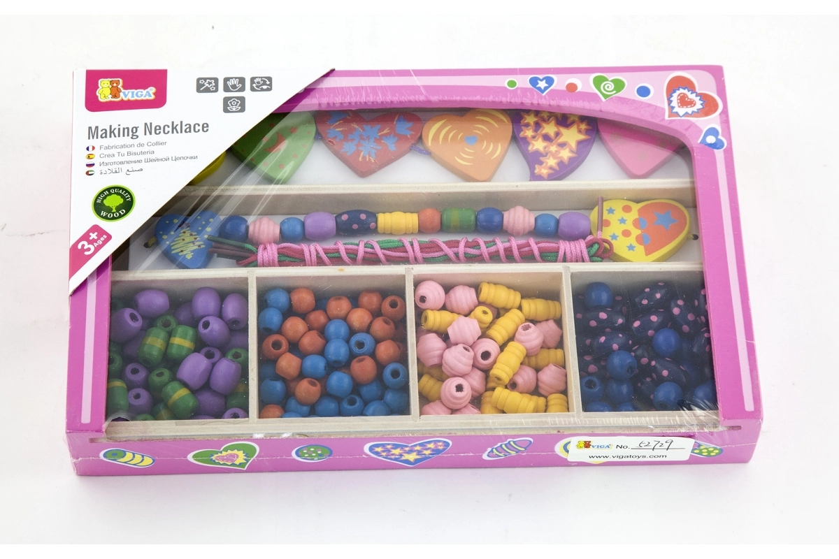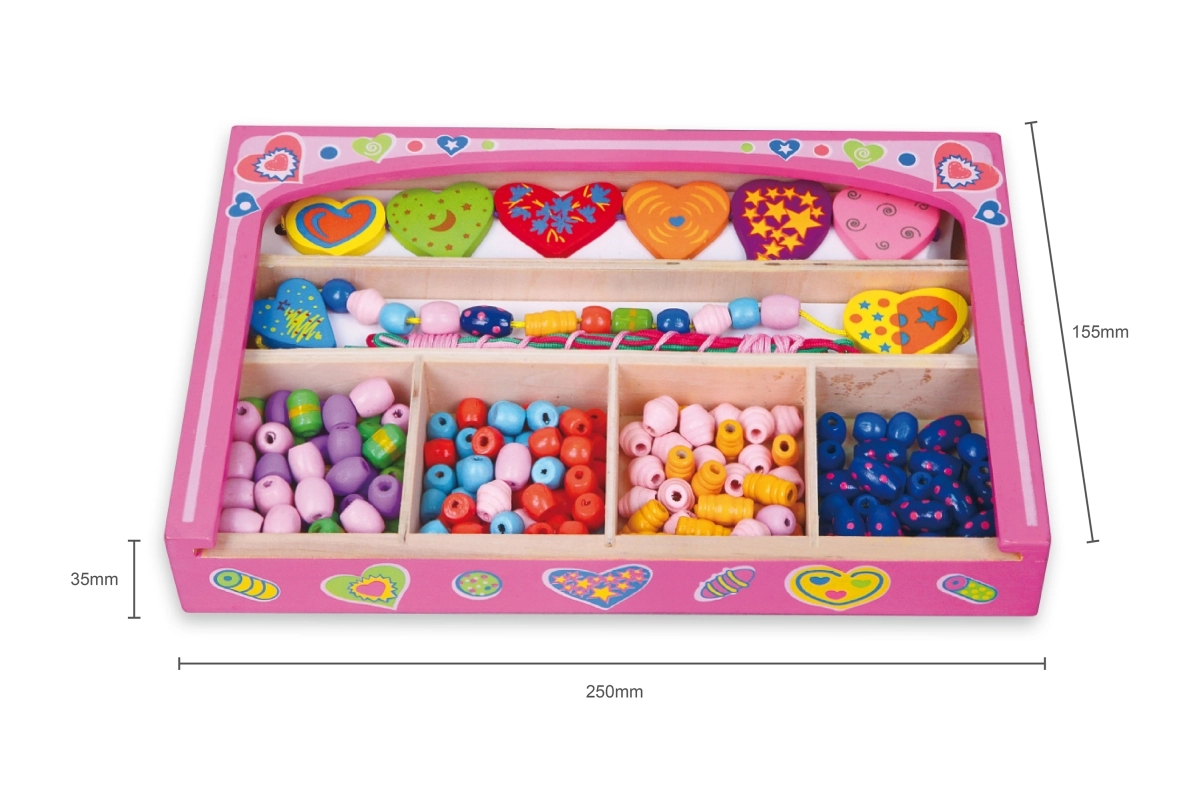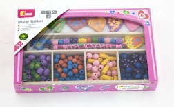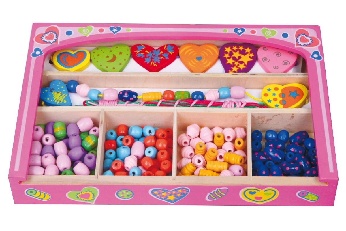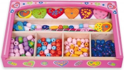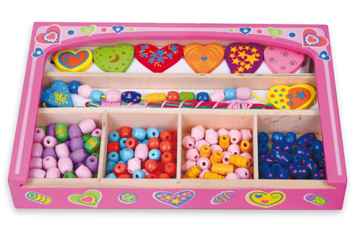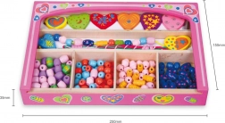 Různobarevné dřevěné korálky, tvary (např. srdíčka, hvězdičky), šňůrky na navlékání, dřevěná krabička s přihrádkami