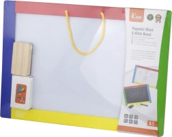 Tato univerzální tabule spojuje dvě kreativní plochy v jednom – černou magnetickou stranu pro křídy a bílou stíratelnou stranu pro fixu. Děti mohou psát, kreslit i trénovat písmenka a číslice; na černé straně navíc snadno přichytí magnetky. V balení najdete vše pro okamžité použití: 4 křídy, stíratelnou fixu a houbičku.