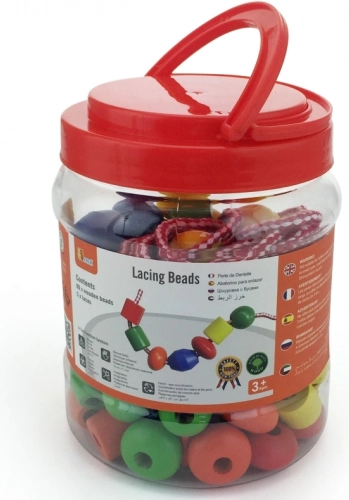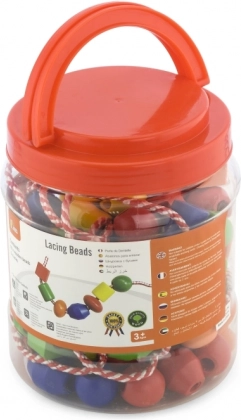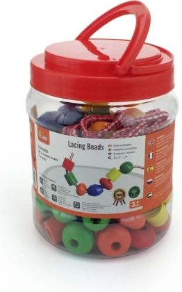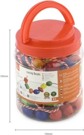 Zábavná sada pro nejmenší rozvíjí jemnou motoriku, trpělivost a kreativitu. V praktické plastové dóze najdete 90 velkých dřevěných korálků a 5 barevných tkaniček k navlékání. Ideální pro děti od 3 let.
