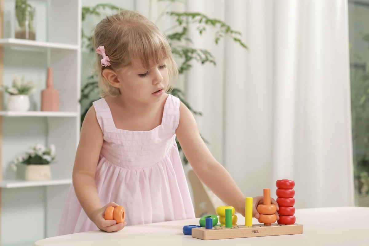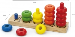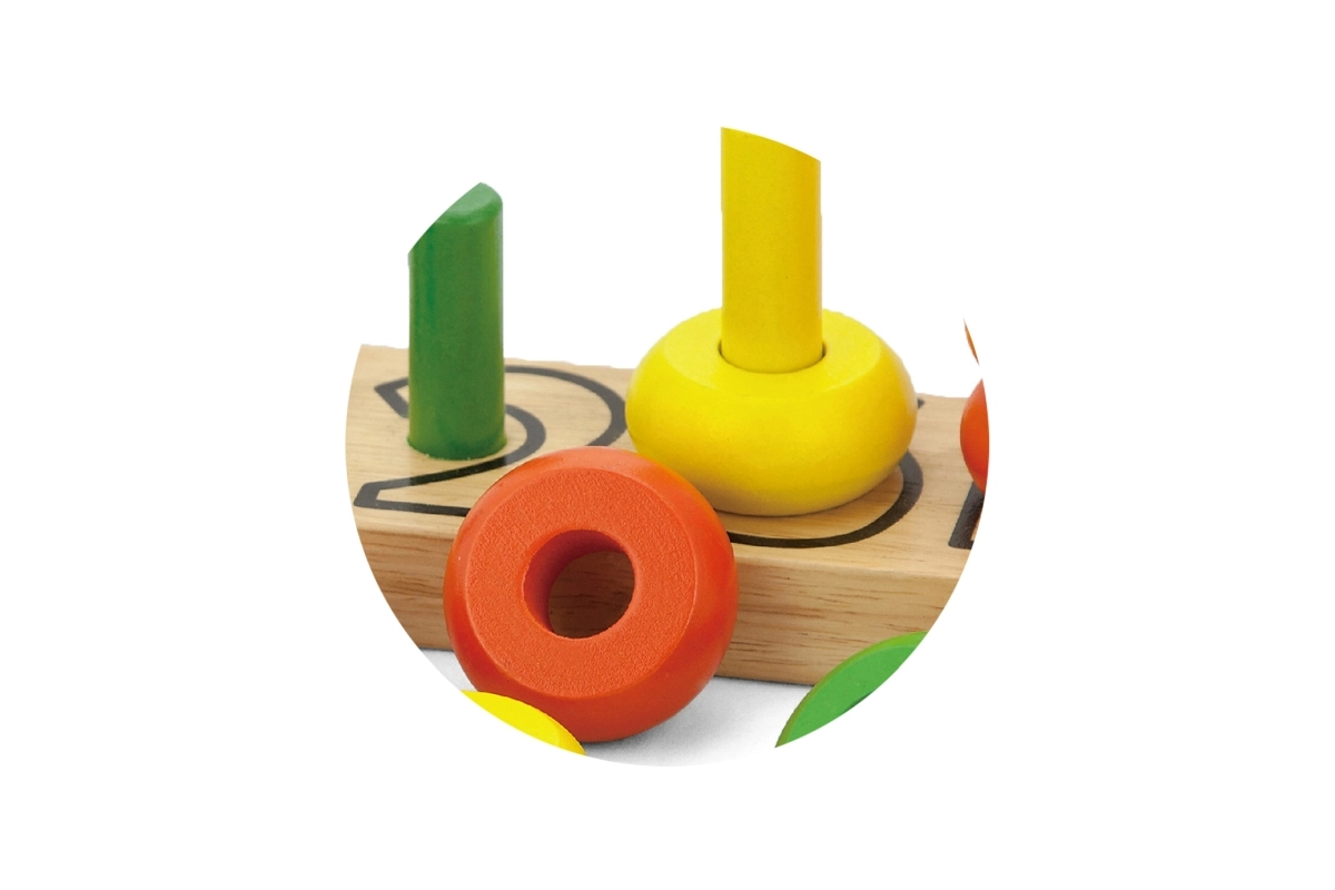 Toto odolné dřevěné počítadlo nabízí dětem bezpečnou a intuitivní formu učení. Na pevné základně jsou svislé kolíky, na které děti navlékají barevné kroužky, třídí je podle barvy a množství a procvičují první početní dovednosti. Hračka podporuje logické myšlení a koncentraci.