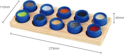 Tento dřevěný hmatový třídicí set kombinuje oblíbené principy sorterů s hlubší sensorickou stimulací. Deska s deseti otvory a sada deseti válců s různými povrchy a materiály podporují soustředění, logické uvažování a rozvoj jemné motoriky.