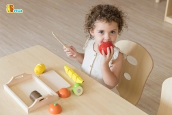 Díky suchému zipu ovoce lze jedním pohybem krájet a znovu spojovat, což podporuje rozvoj jemné motoriky.