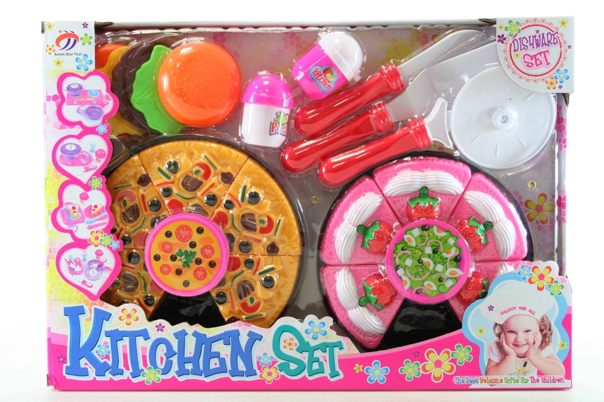 Zábavná plastová sada pro malé kuchaře obsahuje koláč a dort krájený na dílky, hamburger, slánku, pepřenku a kuchyňské náčiní. Ideální pro hraní na vaření a rozvoj motoriky. Bezpečné plastové provedení, realistické doplňky a snadné krájení na dílky potěší děti od 3 let.