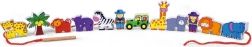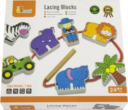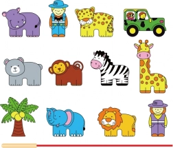 Sada obsahuje dřevěné kostky, které zobrazují obyvatele safari včetně lamparta, palmy, opice, hrocha, zebry, jeepu, žirafy, medvěda, lva, slona a průvodce. Kostky jsou precizně malovány z obou stran netoxickými barvami a přináší dětem mnoho radosti při hraní. Všechny prvky jsou navrženy tak, aby podporovaly rozvoj jemné motoriky a znalosti zvířecího světa.