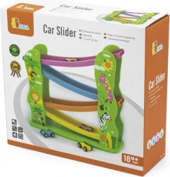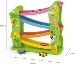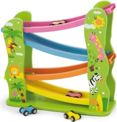 Tato krásně barevná dřevěná klouzačka je perfektní pro vaše nejmenší, kteří si chtějí hrát a zároveň rozvíjet své schopnosti. Obsahuje rampu s několika úrovněmi v různých barvách a umožňuje autíčkům hladce se pohybovat po dráze.