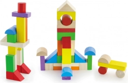 Barevné dřevěné kostky v různých tvarech motivují děti ke skládání a stavění, čímž přirozeně trénují uchop, koordinaci oko–ruka i prostorovou představivost.