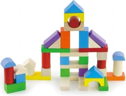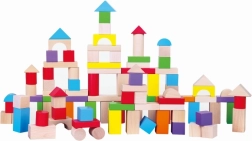Kostky v podobě kvádrů, kostek, válců i oblouků (velikost 2,5–7,5 cm) inspirují ke vzniku věží, mostů i celých městeček.