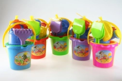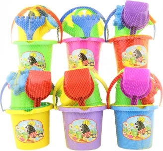 Hrací sada na písek pro děti od 3 let obsahuje vše potřebné pro zábavu na pláži i na hřišti: kyblík, sítko, lopatičku, hrabičky, konvičku a bábovku. Díky praktickému složení a lehkému plastovému provedení je ideální pro malé stavitele. Kompletní výbava do písku, lehké a bezpečné provedení a roztomilý obrázek na kyblíku potěší každého malého stavitele.
