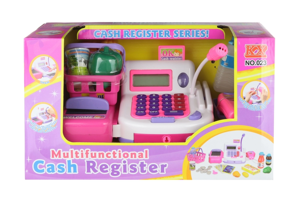 - Realistická hra: pokladna s páskem, čtečkou a úložným šuplíkem na peníze.
