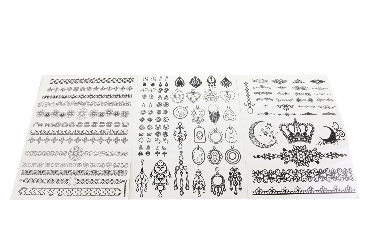 Objevte svět dočasného tetování a ozdob, které si můžete přizpůsobit přesně podle své nálady. Sada nabízí bohatý výběr motivů – od elegantních linek a řetízků až po korunky, měsíce a ornamenty – a barevné fixy pro dokreslení detailů. Třpytivé kamínky dodají každému motivu efektní lesk.