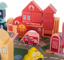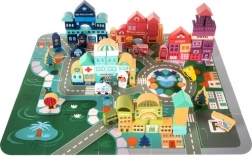 Dřevěné bloky Kruzzel jsou příležitostí pro děti rozvíjet své kreativní schopnosti a přitom se naučit něco o městském prostředí. Součástí setu je barevná hrací podložka znázorňující město s cestami a budovami, která poskytuje fantastické možnosti pro imaginativní hru.