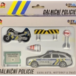 Realistická sada dálniční policie v českém designu z řady City Collection potěší všechny malé ochránce zákona. Obsahuje kovové policejní auto se světelným a zvukovým majákem, plastovou motorku a dopravní značky. Díky pohonu na zpětné natažení je akce na silnici hned v plném proudu. Ideální pro děti od 3 let.
