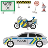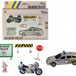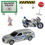 Kovové policejní auto, plastová motorka, plastové dopravní značky